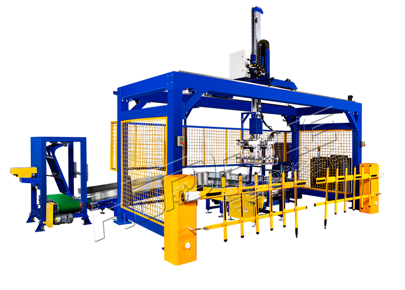 2、將產(chǎn)品按一定排列碼垛放在托盤(pán)上,進(jìn)行自動(dòng)堆碼,可堆碼多層,然后推出,便于叉車運(yùn)到倉(cāng)庫(kù)儲(chǔ)存。