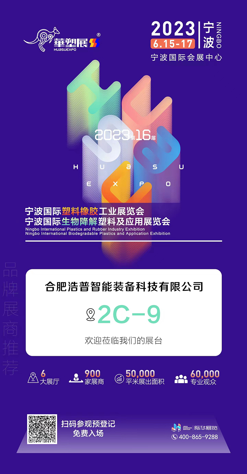 第16屆寧波國際塑料橡膠工業(yè)展覽會將于2023年6月15日至17日在中國?寧波國際會展中心隆重舉行,我司浩普智能特裝展臺號位置于:2館2C-9,熱誠歡迎廣大新老客戶蒞臨我司展位參觀、洽談、指導(dǎo)!